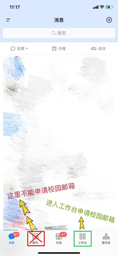 1.进入重庆交通大学企业微信APP。登录成功后,有5个导航栏,请点击工作台,进行校园邮箱申请。请不要点击“邮件”导航栏申请,这里是有校园邮箱并绑定成功后的邮件获取栏,如下图。